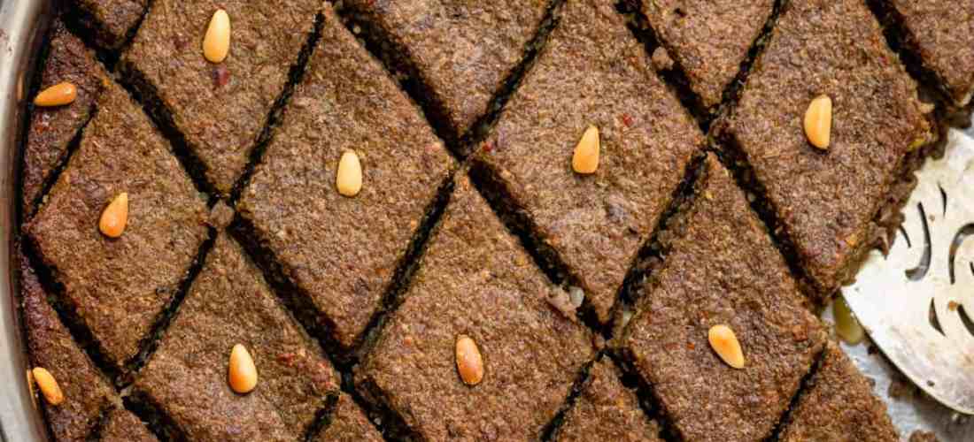 Heat the oven to 350 degrees. Lightly oil a shallow 9-by-13-inch baking dish, then press half the remaining lamb mixture evenly over the bottom of the pan. Spread half the onion-pine nut mixture over the meat. Add the rest of the meat to the pan, patting and pressing it with wet hands to make a smooth top. If desired, score the top with a sharp paring knife to make a traditional diamond pattern at least 1/2-inch deep.