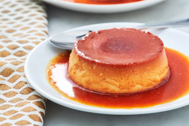 To unmold, run a thin sharp knife around the edges. Center a flat-bottomed platter or serving dish with a rim on top of the pan and, holding both, carefully flip the pan and plate together. The flan will fall onto the plate with a squelch; lift off the pan and let the caramel run all over the top. (If the flan doesn’t come out, flip it back over and rest the bottom of the pan on a hot wet kitchen towel for a few minutes, to melt the caramel.) Serve chilled, in slices.