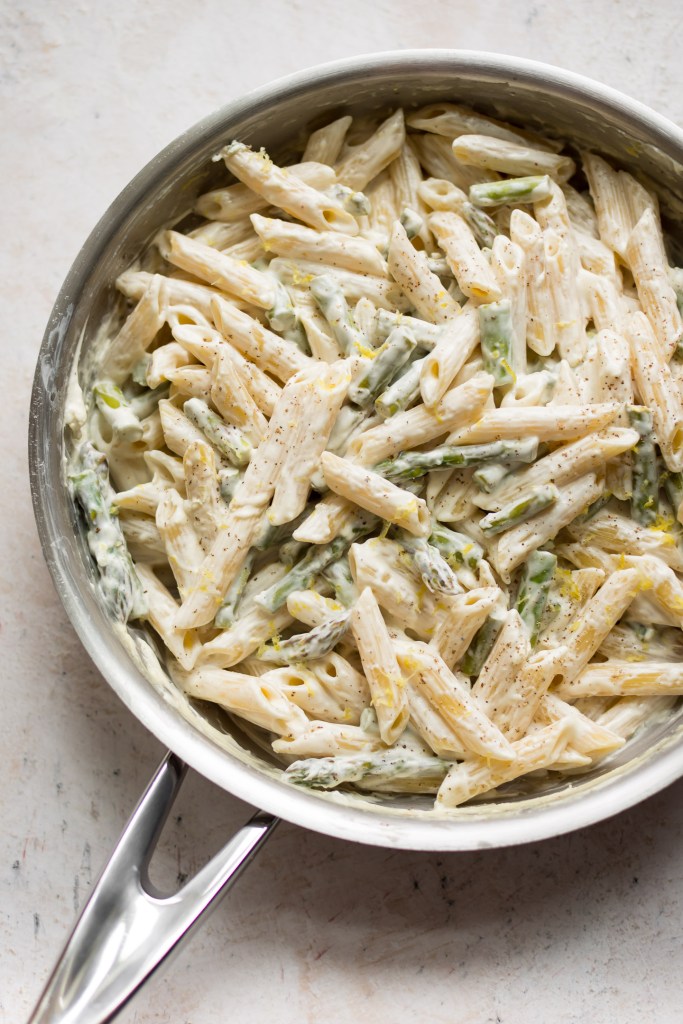 Add the asparagus and cook until it’s tender-crisp (5-15 min depending on thickness of asparagus) and the sauce has thickened to your liking. If the sauce becomes too thick, and some more chicken broth. Season the sauce with salt & pepper as needed. –